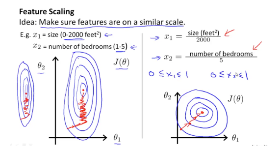 만약 데이터를 그대로 사용하게 되면 비용함수 J에 대한 등고선이 왼쪽처럼 feature의 Scale에 따라 홀쭉하거나 뚱뚱한 형태 를 띄게 됩니다.