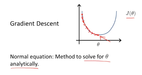 여기서 반복적인 연산이 이뤄진다는 점이 경사 하강 알고리즘의 단점 이라고 할 수 있습니다. 하지만 Normal Eqution을 이용하면 한번에 θ를 구할 수 있습니다.