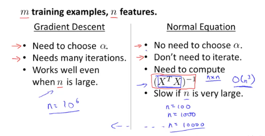 1) Gradient Descent algorithm은 적절한 learning rate 를 찾아야 하며, 반복적인 연산 이 필요합니다. 이에 비해 Normal Equation은 알파 값이 없이 한번의 연산으로 θ를 찾을 수 있습니다.