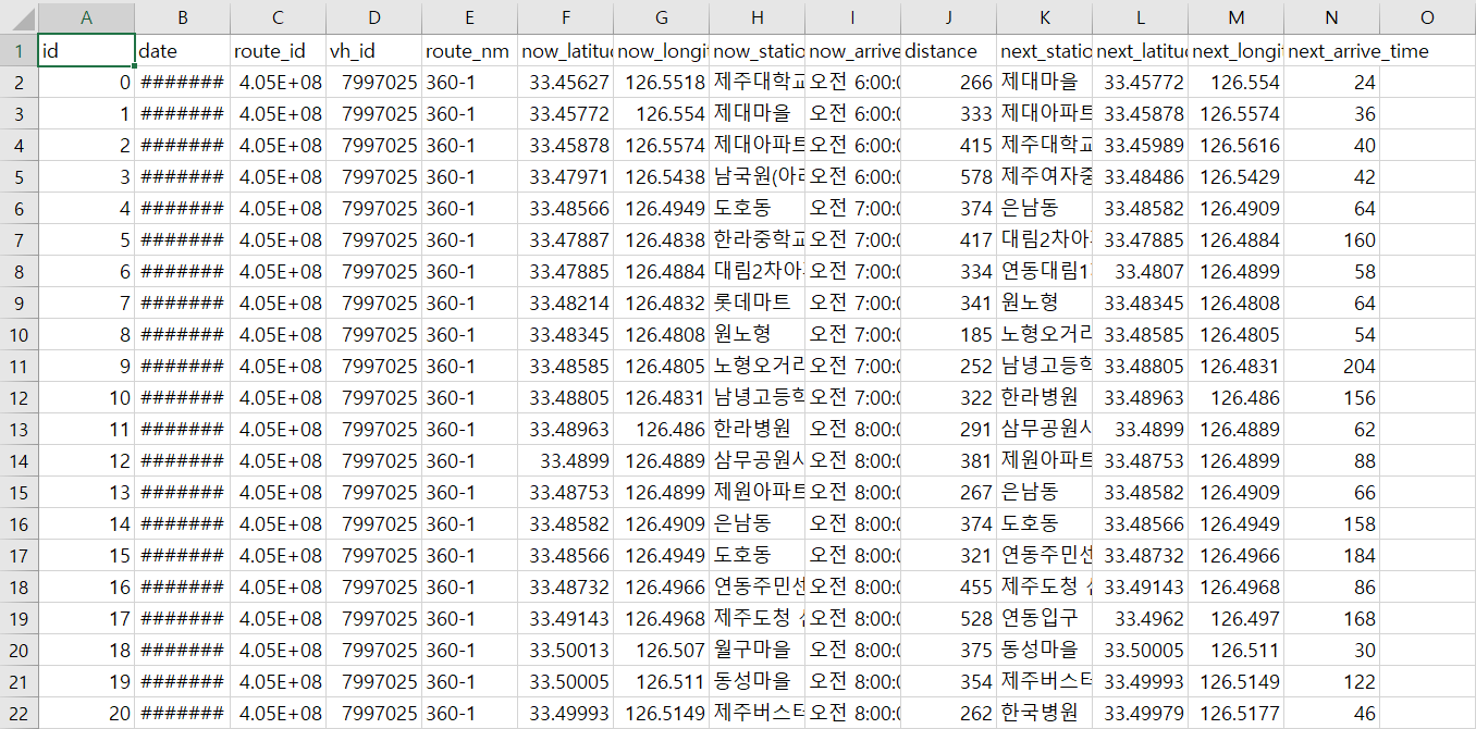위는 제가 참여했던 대회에서 버스 정보를 이용하여 버스의 도착 시간을 예상하는 모델 을 만들어 보라고 저에게 주어진 데이터입니다.