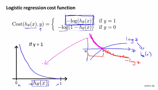 이때 Cost 함수는 -log(1-h(x)) 으로 예측값이 h(x)가 0에 가까울수록 비용이 줄어들고 1에 가까워질수록 양의 무한으로 발산됩니다.