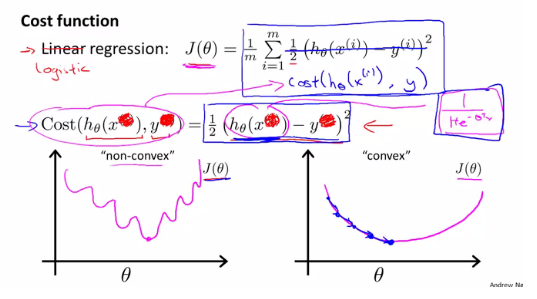 하지만 우리가 배웠듯이 Gradient Descent Algorithm으로 최적의 θ를 구하기 위해서는 Cost Function이 하나의 Global minimum을 가지는 convex(볼록)한 형태를 가져야합니다. 반면에 non-convex는 꼬불꼬불한 탓에 수많은 local minimum을 가지기에 활용하기 적합하지 않습니다. 따라서 Logistic Regression을 위한 별도의 Cost Function이 필요합니다.