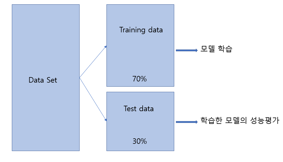 쉽게 말해서 우리에게 100개의 data가 주어진다면 이것을 모두 학습에 사용하는게 아니라, 30%를 떼어놓고 70%만 학습에 사용한 후 모델의 성능을 측정하는데 나머지 30%를 사용하는 것입니다.