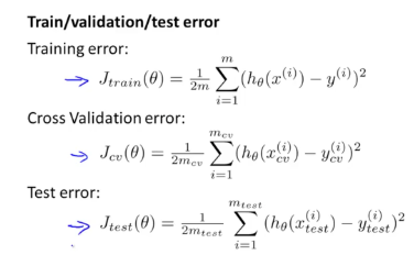 그래서 일반적으로 dataset을 Training set : CV set : Test set의 비율을 60 : 20 : 20로 나누어 학습에 이용하고 세 가지의 dataset의 Cost 공식은 위와 같습니다.