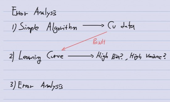 3) 그리고 마지막에 이뤄지는 것이 Error Analysis입니다. 즉 Cv data를 적용했을 때 발생하는 오류를 우리가 면밀히 검토하면서 발생한 에러의 원인은 무엇이고 어떤 특징을 가지는지 분석하는 것입니다.