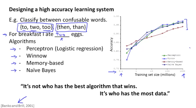 단어를 찾아 문장을 완성하는 머신러닝 알고리즘을 만든다고 했을 때 다양한 알고리즘들을 생각해볼 수 있습니다. 네가지 알고리즘 모두 성능에는 큰 차이가 없습니다. 다만 우리가 알 수 있는 것은 Dataset이 커질 수록 accuracy가 더욱 높아진다는 것입니다.
