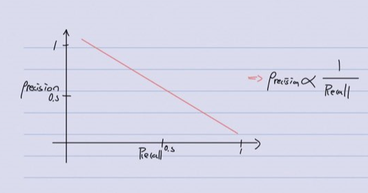 Precision과 Recall은 반비례 관계를 가집니다. Threshold는 True와 False를 나누는 기준선으로 Logisitc Regression의 경우 0.5였습니다. Threshold가 높아질수록 기준선이 높아지는 것이므로 True로 검출되기 까다로워집니다.