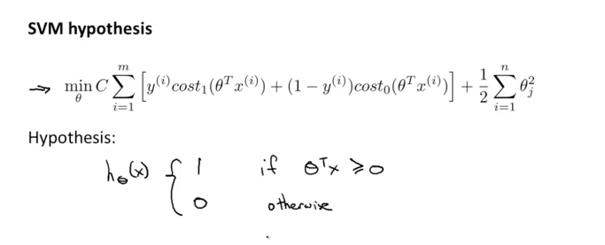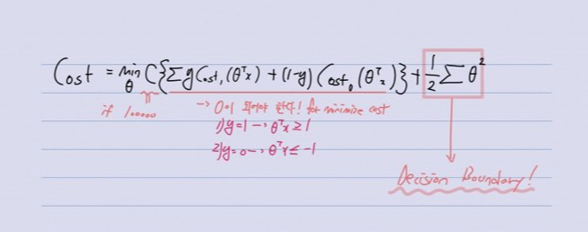 이렇게 Logistic Regression의 Cost 함수에서 몇가지 변경을 해주면 위와 같은 SVM의 Cost 함수가 정의됩니다. 이때 $θ^Tx > 0$일때 $h_θ(x)$는 1이고, 그렇지 않으면 0이 됩니다.