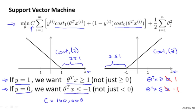 이제 C를 살펴보겠습니다. 만약 C=100000로 아주 큰 값이라고 해보겠습니다. 이때 Cost 값이 최소화되기 위해선 Cost함수가 포함되어있는 Σ가 0이 되어야 할 것입니다. 이를 위해선 $y=1$일때는 $z ≥ 1$이어야 하고 $y=0$일때는 $z ≤ -1$이어야 합니다.