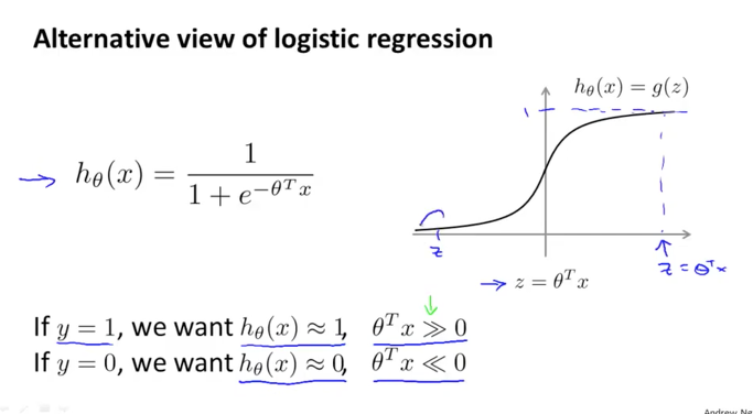 Logistic Regression의 가설함수 $h(x)$를 살펴보겠습니다. 실제값 $y=1$일때 $h(x)$가 1에 가까워져야하므로 $θ^Tx$도 0보다 큰 값이 될것이고, $y=0$일때 $h(x)$는 0에 가까워져야하므로 $θ^Tx$도 0보다 작은 값이 될것입니다. 이때 우리는 $θ^Tx$를 편의상 z라고 합니다.