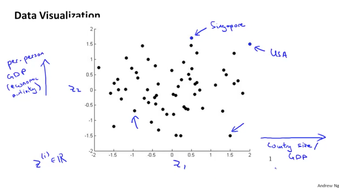 이를 2차원의 그래프로 표현한 결과입니다. 각 점이 나라를 나타내며, 그래프를 이해하기 위해서는 $z_1, z_2$를 대략적으로 설정하면 어떤 의미일지 파악할 수 있습니다. 이렇게 차원을 줄이고 나니 그래프로 표현이 가능함에 따라 나라별 데이터간의 차이가 한눈에 보이기 때문에 많은 장점들이 있다고 할 수 있습니다.