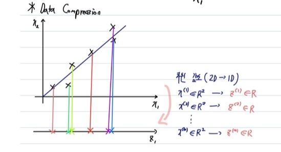 여기서 이 2차원의 데이터를 하나의 선에 투영하면, 1차원의 점들로 표현할 수 있습니다 다시 말해서 2차원의 점 $x^{(i)}$을 z라는 선에서 1차원으로 바라봐서 $z^{(i)}$이라는 1차원 데이터로 바라볼 수 있는 것입니다.