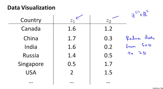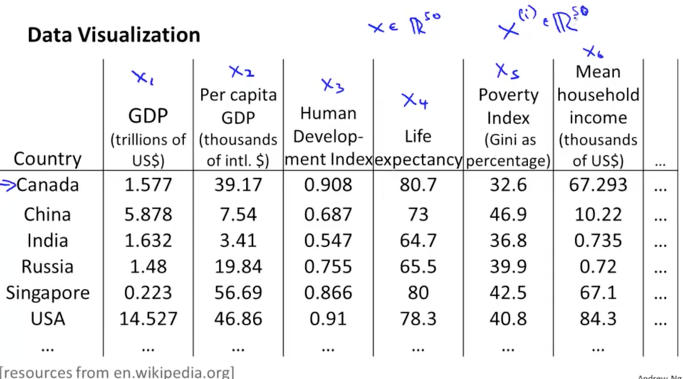 이번엔 데이터를 이해하기 위한 하나의 방법인 'Data Visulalization'입니다. 예를 들어 위와 같이 각 나라에 대한 데이터가 있습니다. 이 데이터에는 나라별로 50가지의 경제 관련 통계 자료가 들어있습니다. 즉 50차원입니다.