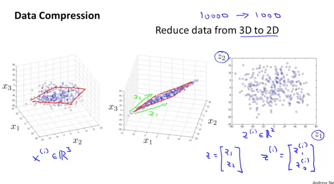 이번에는 3차원의 데이터를 2차원으로 차원 감소시켜보겠습니다. 이 경우 3차원 데이터를 2차원의 사각형에 투영하는 형태를 생각해볼 수 있습니다. 다시 말해서 3차원 데이터로 $x_1, x_2, x_3$ 값을 가지던 vector $x^({i)}$은 $z_1, z_2$ 값을 가지는 vector $z^({i)}$로 다시 표현되는 것입니다.