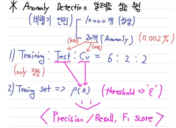 여기에서 더 나아가 보통 Anomaly Detection 알고리즘을 평가할 때는, 'Precision / Recall'을 이용한 'F1 Score'를 이용합니다. 따라서 Cv set을 이용하여 여러 $ε$에 대한 각 알고리즘의 F1 score를 이용하여 최적의 $ε$ 값을 찾아낼 수 있습니다. 그 후 최종적인 알고리즘을 평가할 때 Test set을 이용하게 됩니다.