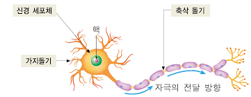 - 각 뉴런은 수상돌기(입력) 를 통해 다른 뉴런에서 신호를 받아 축삭돌기(출력) 에서 다른 뉴런으로 신호를 보낸다.