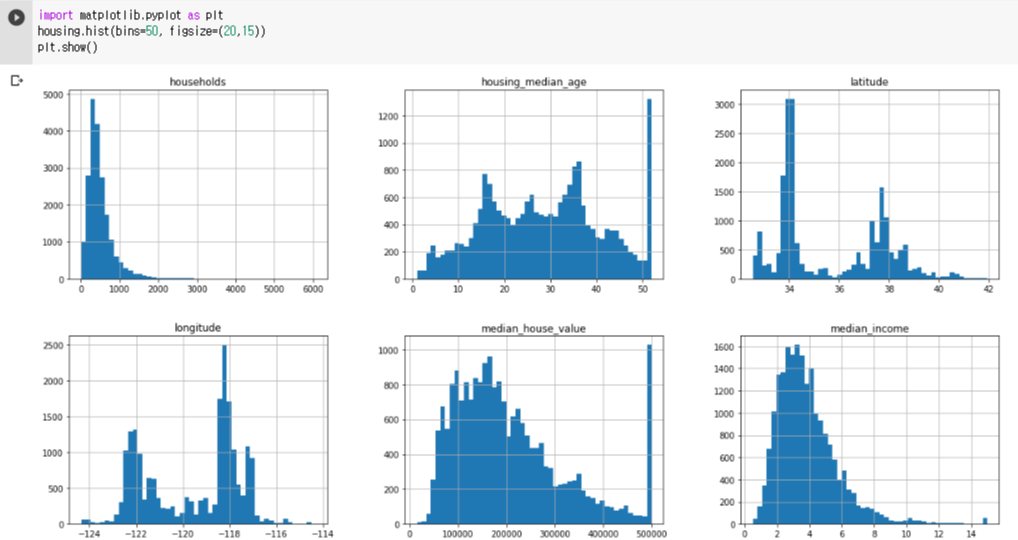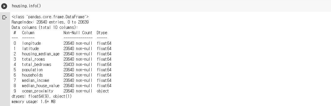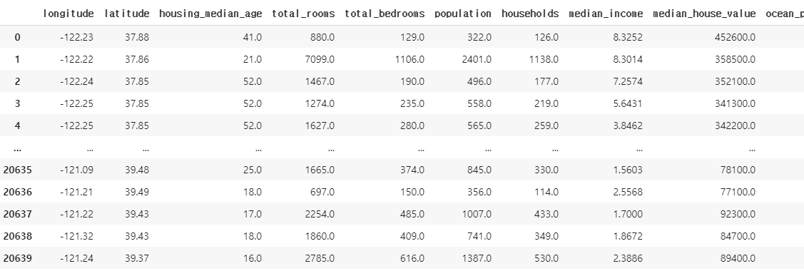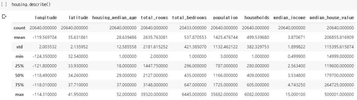 - 4번째 feature인 total_bedrooms만 20433개의 Null이 아닌 값을 가지는데, 이는 나머지 207개의 구역이 이 feature를 가지고 있지 않기 때문입니다.