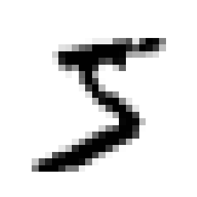 70000개의 이미지는 28 * 28 픽셀이기 때문에 784개의 feature를 가지고 있습니다. 각 feature는 0~255사이의 픽셀 강도를 나타냅니다. 하나의 이미지를 확인하기 위해서는 1) 이미지의 feature 벡터를 28 * 28 배열로 크기를 바꾸고, 2) matplotlib의 imshow() 함수를 사용해 그려줍니다.