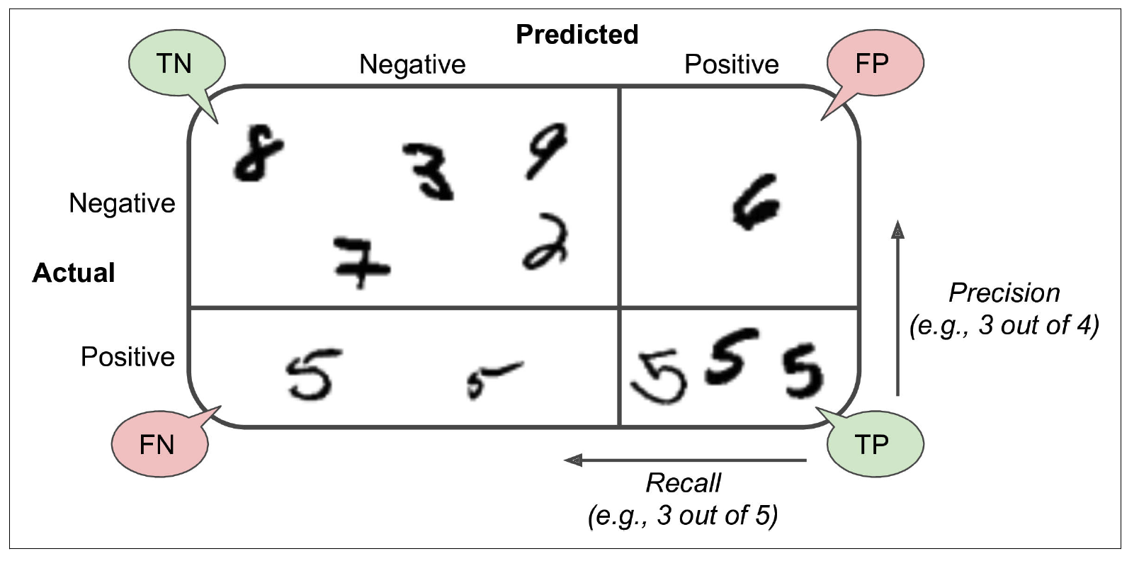 Decision Threshold가 위 그림에서 두개의 숫자 5 사이라고 가정해보겠습니다. 이 기준선의 오른쪽에는 4개의 True Positive와 하나의 False Positive가 있습니다. 그러므로 이 threshold에서 Precision은 80%라 할 수 있습니다. 하지만 실제 숫자 5는 6개이고 이중 Classifier는 4개만 감지했으므로 Recall은 67%입니다.