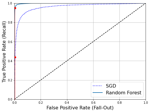 이제 ROC 곡선을 그려보고 SGDClassifier와 RandomeForest를 비교해보겠습니다. 아래 그래프 결과를 보면 RandomForest의 결과가 훨씬 좋은 것을 확인할 수 있습니다.