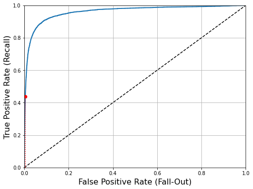 ROC 곡선도 Binary Classification에서 많이 쓰이는 도구 중 하나입니다. ROC 곡선은 False Positive 비율(FPR)에 대한 True Positive 비율(TPR, Recall의 다른 이름)의 곡선입니다. FPR은 1 - True Positive 비율(TPR)입니다. TPR은 특이도(specificity)라고도 합니다. 다시 말해서 ROC 곡선은 Recall에 대한 1 - specificity라고 할 수 있습니다.