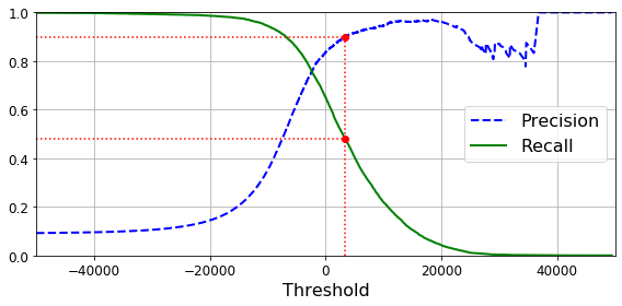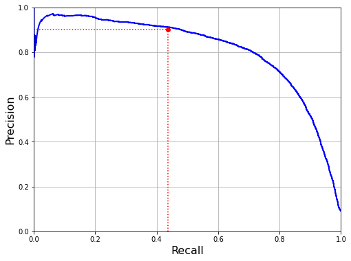 이 예측에 대한 Precsion과 Recall을 확인하면, Precision 90%를 실제로 달성했음을 볼 수 있습니다.