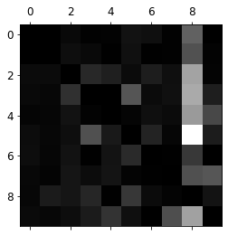 이제 이미지로 표현할 건데 주대각선만 0으로 채우겠습니다. 행은 실제 클래스, 열은 예측한 클래스입니다. 클래스 8의 열이 밝다는 것은 많은 이미지들이 8로 잘못 분류되었음을 의미합니다.