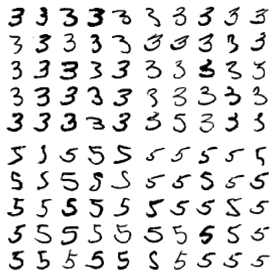 좀 더 깊이 들어가 개개의 에러를 분석해보면 Classifier가 무슨 일을 하고, 왜 잘못되었는지에 대해 통찰은 얻겠지만, 난이도는 훨씬 높고 시간도 오래 걸릴 것입니다. 예를 들어 3과 5의 데이터들을 비교해보겠습니다.