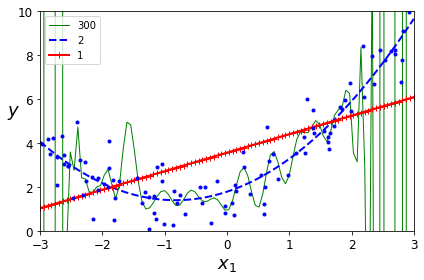 Polynomial Regression을 통해 degree가 올라가게 되면 모델은 Training data에 더 fit해집니다. 다음 그래프는 300차와 2차 Polynomial Regression 그리고 단순 Linear Regression 모델 세 개를 비교하는데, 300차가 가장 구불구불하면서 fit한 모습을 보여주고 있습니다.
