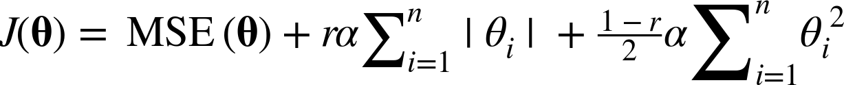 Elastic net은 Ridge와 Lasso를 섞은 모델입니다. 말 그대로 Ridge와 Lasso의 Regularization 항을 모두 더하고, 그 혼합 비율을 $r$을 사용해 조절합니다.