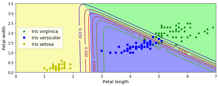 위 그래프에서 decision boundary는 검은색 점선입니다. 이외에 주목할 점으로는 0.900이라고 명시된 초록색 선 위에 있는 데이터는 90% 이상의 확률로 Iris-Verginica로 분류된 데이입니다. 그리고 0.150이라고 명시된 파란색 선 아래에는 15% 미만으로 음성 클래스로 분류된 데이터들입니다.
