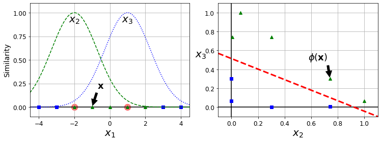 쉽게 설명하자면 나머지 데이터들이 정해진 랜드마크와 얼마나 닮았느냐에 대한 수치가 y축인 유사도인것입니다. 예를 들어 랜드마크 $x_1 = -2$에 대해 $x_1 = -1$과 $x_1 = 4$ 두개에 대해 -1이 -2와 더 가까우므로 유사도가 높은 것입니다.