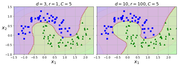 왼쪽 그래프는 3차 Polynomial Kernel을, 오른쪽은 10차를 적용하였습니다. 추가하는 feature의 차수가 높아질수록 Margin Violation이 감소되게끔 경계가 변하는 것을 볼 수 있습니다.
