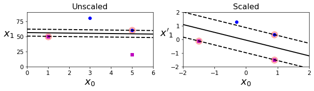 왼쪽 그래프는 $x_1$과 $x_0$의 Scale이 달라 Margin이 거의 없는 경계가 생성되었습니다. 반대로 이 feature들의 스케일을 조정하면 오른쪽처럼 경계가 훨씬 좋아집니다.