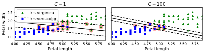 sklearn의 SVM 모델의 하이퍼 파라미터중 하나인 $C$는 이러한 트레이드 오프를 정하는데 사용됩니다. 이 $C$가 높을 수록 모델은 Margin Violation을 허용하지 않으려 합니다. 반대로 $C$가 낮으면 Margin Violation은 높아지겠지만 일반화가 더 잘될 것입니다.