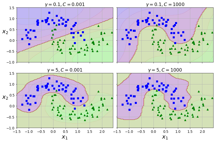 위 그래프에서 알 수 있듯이 $γ$가 커질수록 앞서 봤던 종 모양의 그래프가 좁아지면서 각 데이터의 영향 범위가 줄어드는 효과를 가져옵니다. 이에 따라 경계는 좀더 구불구불해지고 불규칙해집니다.