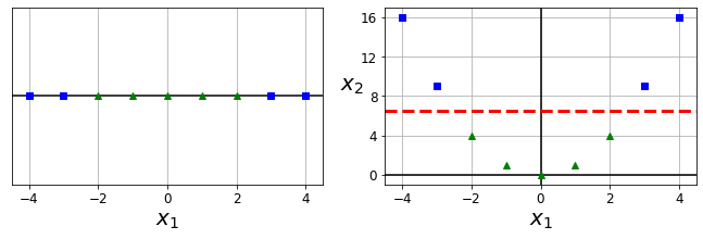 왼쪽 그래프는 $x_1$이라는 하나의 feature만 가지는 데이터셋으로 선형적으로 분류가 안되지만, $x_2=(x_1)^2$라는 새로운 특성을 추가하면 오른쪽처럼 완벽하게 선형적으로 분류가 가능합니다.