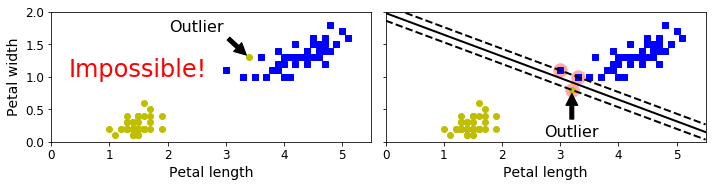 따라서 왼쪽 그래프처럼 이상치가 존재하는 경우 Hard하게 분류하는 것은 불가능합니다. 게다가 오른쪽처럼 분류할 수 있다하더라도 완벽하게 분류하기 위해선 margin이 거의 없는 경계를 만들어야하는 상황이 발생하게 됩니다.