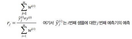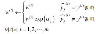 그 다음 알고리즘은 다음 식을 사용해 잘못 예측한 경우에만 해당 데이터의 가중치를 $\alpha_j$를 이용해 갱신합니다.