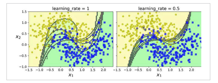 다음은 AdaBoost방식으로 갱신되어 가는 다섯개의 연속된 예측기의 결정 경계입니다. moons 데이터셋을 사용하였고, 모델은 규제를 강하게 한 RBF 커널 SVM Classifier입니다. Classifier의 성능이 가면 갈 수록 좋아지는 것을 확인할 수 있습니다.