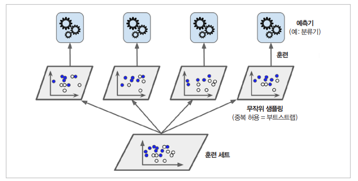 이때 Training dataset에서 중복을 허용하여 subset을 나눠 학습하는 것을 배깅(Bagging), 중복을 허용하지 않는 것을 페이스팅(Pasting)이라고 합니다.