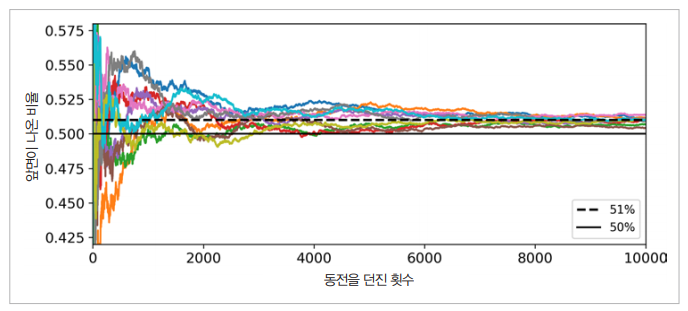 이것이 가능한 이유는 바로 큰수의 법칙 때문입니다. 예를 들어 앞면이 51%, 뒷면이 49%가 나오는 불균형한 동전이 있다고 가정하겠습니다.