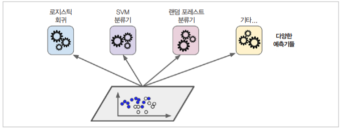 마찬가지로 머신러닝에서도 적당한 성능의 모델 여러개들로부터 예측을 수집하는 것이 가장 좋은 하나의 모델의 예측보다 더 좋은 결과를 불러옵니다.