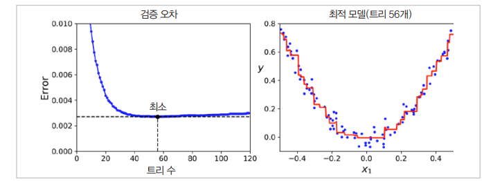 - 트리가 앙상블에 추가될 수록 앙상블의 예측은 더욱 좋아집니다.
