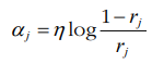 두 번째 예측기의 가중치 $\alpha_j$는 다음 식으로 계산됩니다. 여기서 n처럼 생긴 저 기호는 learning rate입니다. 예측기가 정확할수록 에러율은 낮으므로 $\alpha_j$은 높아지게 되고, 성능이 매우 안좋다면 음수까지도 갈 수 있습니다.