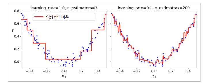 다음 그래프에서 왼쪽은 트리가 너무 적어 Underfitting된 앙상블이고, 오른쪽은 반대로 너무 많아서 Overfitting된 앙상블입니다.