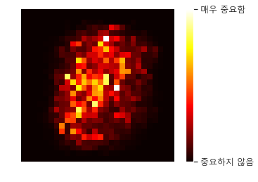이러한 특징은 이미지를 Classification하는데 모델이 어느 곳을 중점적으로 보는지 판단하는데 활용될 수 있습니다. 다음은 MNIST 데이터셋에서 Random Forest Classifier를 학습하고 각 픽셀의 중요도를 그래프로 나타낸 결과입니다.
