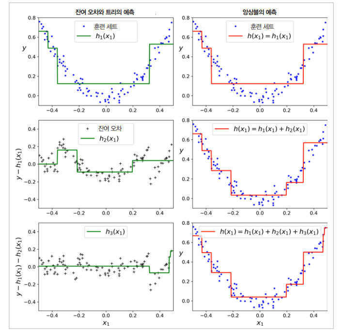 - 두번째 행의 앙상블은 첫 번째 트리의 잔여 오차를 학습하였습니다. 직관적으로 보면 앙상블의 예측이 $h_2(x_1)$와 잔여 오차를 더한 값임을 볼 수 있습니다.