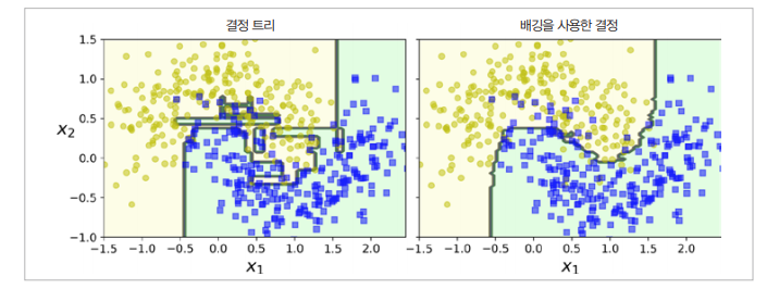 다음은 하나의 Decision Tree의 결정 경계와 앞서 본 코드로 학습한 Bagging 앙상블의 결정 경계를 비교한 것입니다. Training set의 오차 수는 서로 비슷할지 모르나, 경계가 덜 불규칙한 앙상블의 예측이 훨씬 더 일반화를 잘할 것이라고 생각할 수 있습니다.