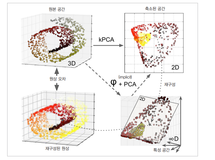 차원 축소된 데이터를 다시 복원하면 이때의 데이터는 원래 차원의 공간이 아닌 위 그림에서 x로 표시된 feature space에 놓이게 됩니다. 이것은 무한 차원이기 때문에 재구성 오차 등의 계산이 불가능합니다. 다행히도 재구성된 데이터의 위치와 가깝게 매핑된 원본 공간의 위치는 찾을 수 있는데 이를 재구성 원상(pre-image)라고 합니다.